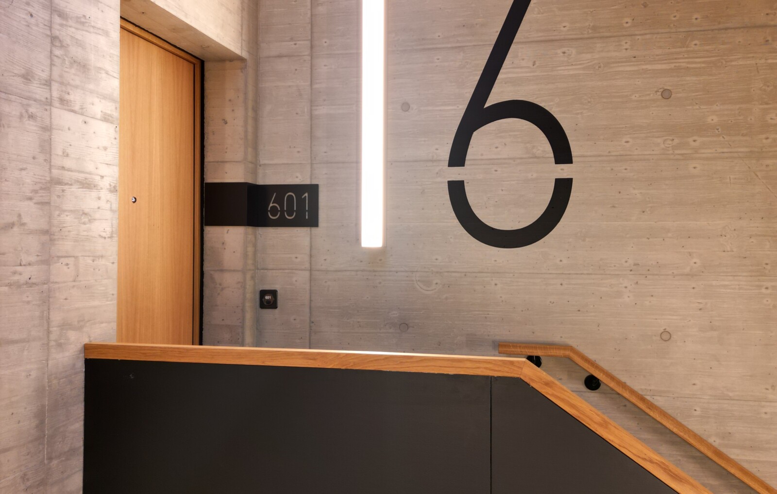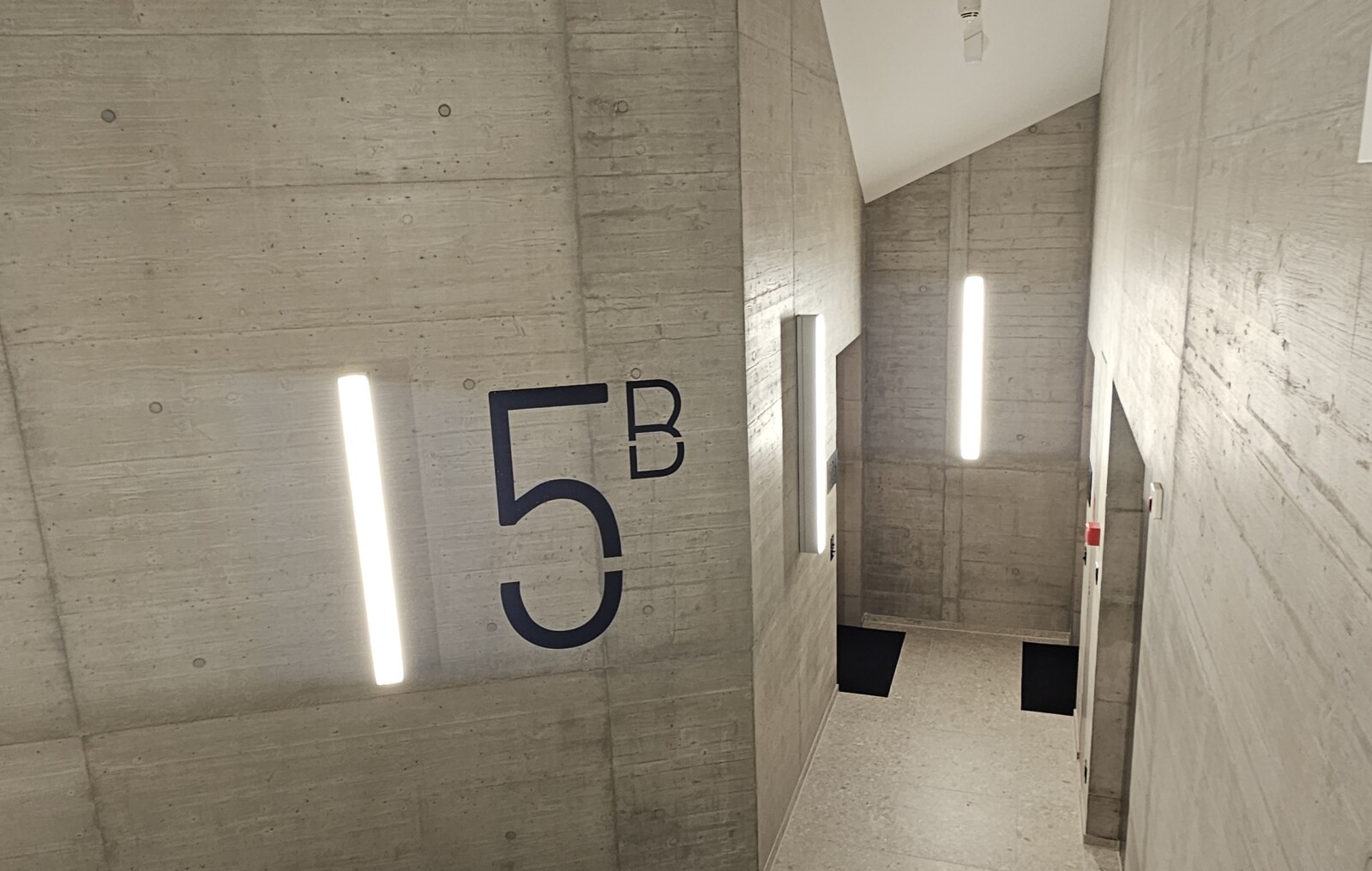 Ein besonderer Schwerpunkt des Projekts lag auf den anspruchsvollen Sichtbetonarbeiten im Haus Ôri. Das gesamte Treppenhaus sowie die Betondecken im Erdgeschoss und im ersten Obergeschoss wurden in Sichtbeton der Qualität 4.1.4 ausgeführt. Zur Erzielung einer hochwertigen, gleichmässigen Struktur kam der Schalungstyp 4.4 zum Einsatz. Dabei werden Schaltafeln anstelle von Brettern verwendet, um eine ruhige, präzise Tafelstruktur im Betonbild zu gewährleisten. Die Anforderungen an Fugen, Stösse und die exakte Anordnung der Tafeln sind bei dieser Schalungsart besonders hoch. Das Schalungs- und Fugenbild muss sorgfältig im Schalungsplan definiert und auf der Baustelle konsequent umgesetzt werden, um ein homogenes Erscheinungsbild zu erreichen. Zusätzlich erschwert wurde die Ausführung durch die baulichen Gegebenheiten im Treppenhaus: zahlreiche Ecken, Kanten, Absätze und unterschiedliche Geschosshöhen stellten hohe Anforderungen an Präzision, Detailplanung und handwerkliches Geschick – sowohl beim Einmessen als auch bei der Herstellung und beim Betonieren.