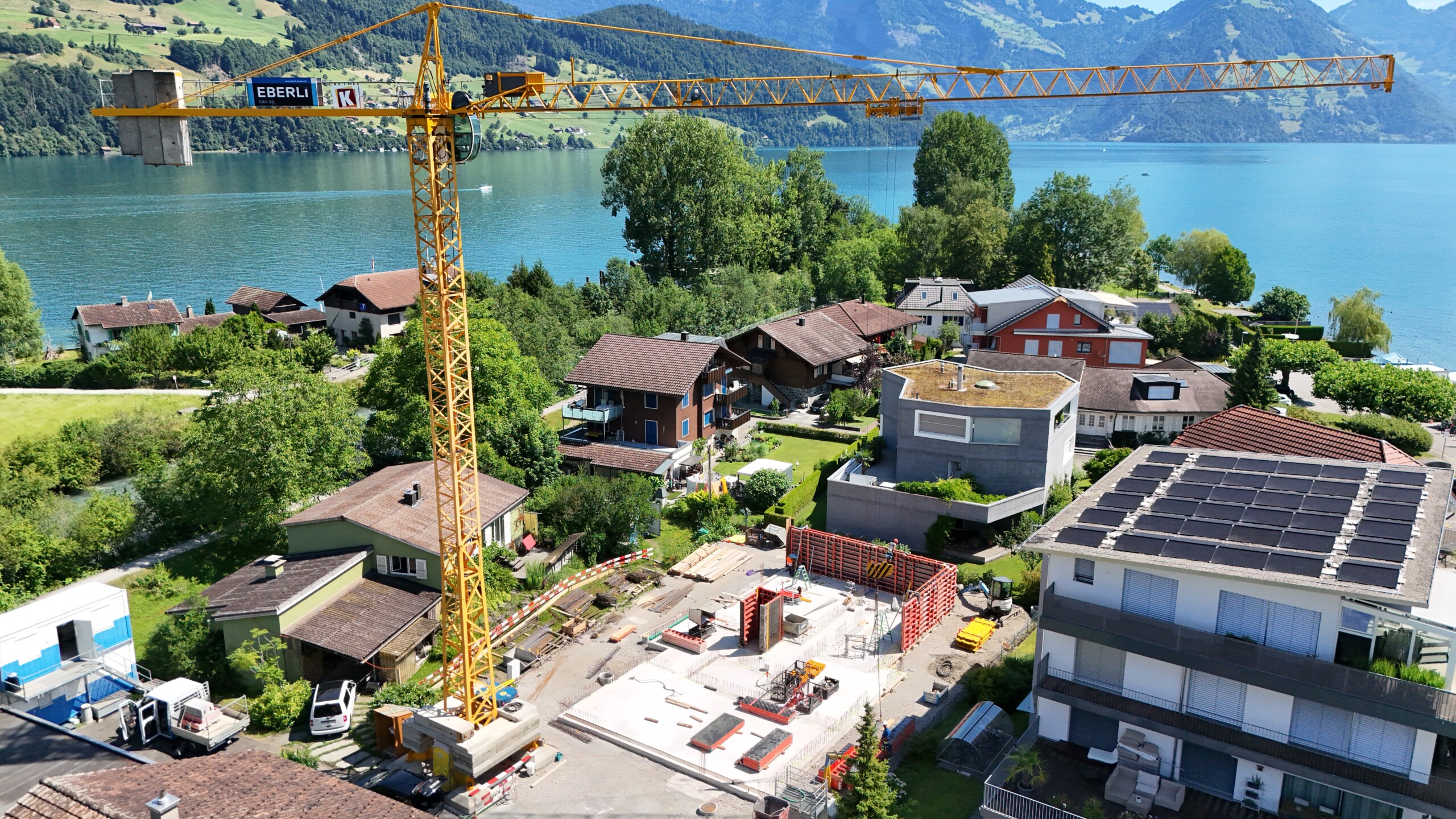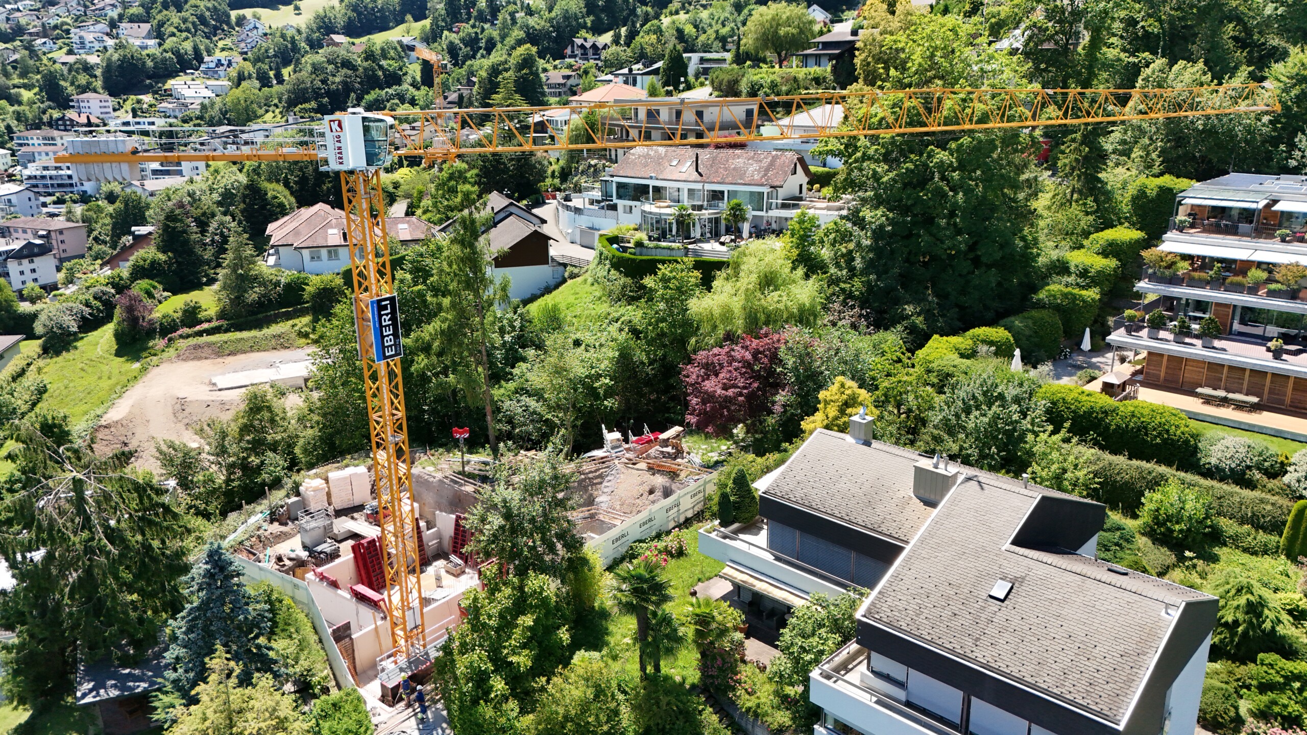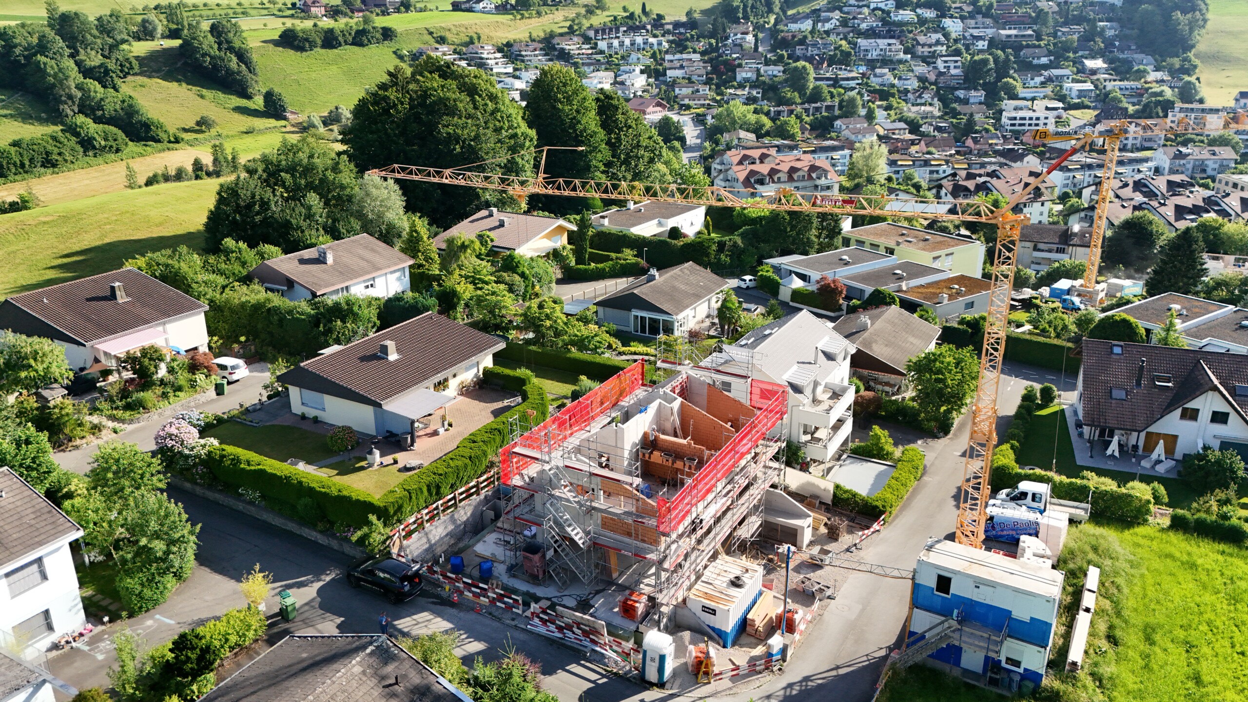 Die Baustelle für das Einfamilienhaus Kehlhofhalde 13 befindet über dem Dorfzentrum von Adligenswil und bietet im Erd- und Obergeschoss einen atemberaubenden Blick auf die Zentralschweizer Bergwelt. Im Untergeschoss befindet sich eine Garage mit einem Lift, der zu den Wohnetagen und einem Dachausstieg führt. Die